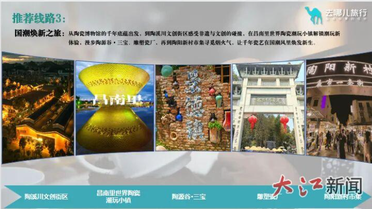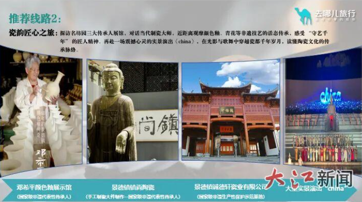线路2:瓷韵匠心之旅。探访邓希平颜色釉展示馆、镇尚陶瓷、诚德轩等国家级非遗代表性传承人展示馆及国家级非遗生产性保护示范基地,与当代制瓷大师面对面交流,近距离观摩颜色釉、青花等非遗技艺的活态传承,感受“守艺千年”的匠人精神。此外,还可欣赏实景演出《china》,在光影与歌舞交织中穿越瓷都千年岁月,读懂陶瓷文化传承脉络。