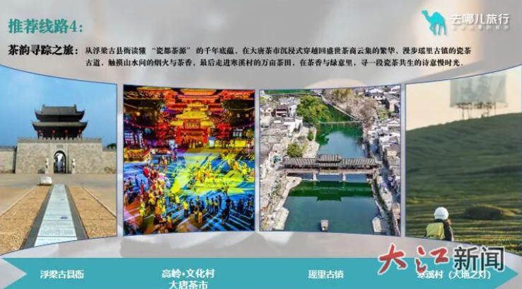 线路4:茶韵寻踪之旅。走进浮梁古县衙,解读“瓷都茶源”的千年底蕴;在大唐茶市沉浸式体验盛世茶商云集的繁华景象;漫步瑶里古镇瓷茶古道,触摸山水间的烟火与茶香;最后走进寒溪村万亩茶田,在绿意与茶香中,寻觅瓷茶共生的诗意慢时光。