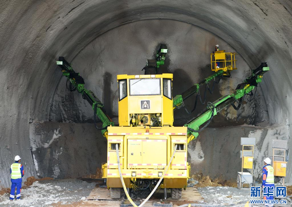 2月5日,在井冈山隧道施工现场,智能化三臂凿岩台车在作业。