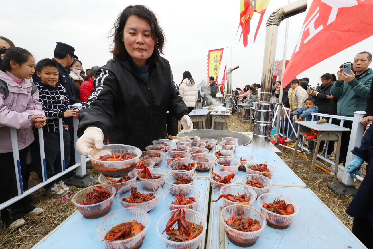 紧接着,扑鼻的鲜香将人群引向美食品鉴区。十口大锅依次排开,麻辣、蒜蓉、油焖……各色小龙虾在滚油中嗞啦作响。“专门从广东南雄开车过来,就为了这口‘新春第一鲜’!”游客陈华平吃得赞不绝口,“虾肉饱满又弹牙,还带一丝清甜,确实鲜!”
