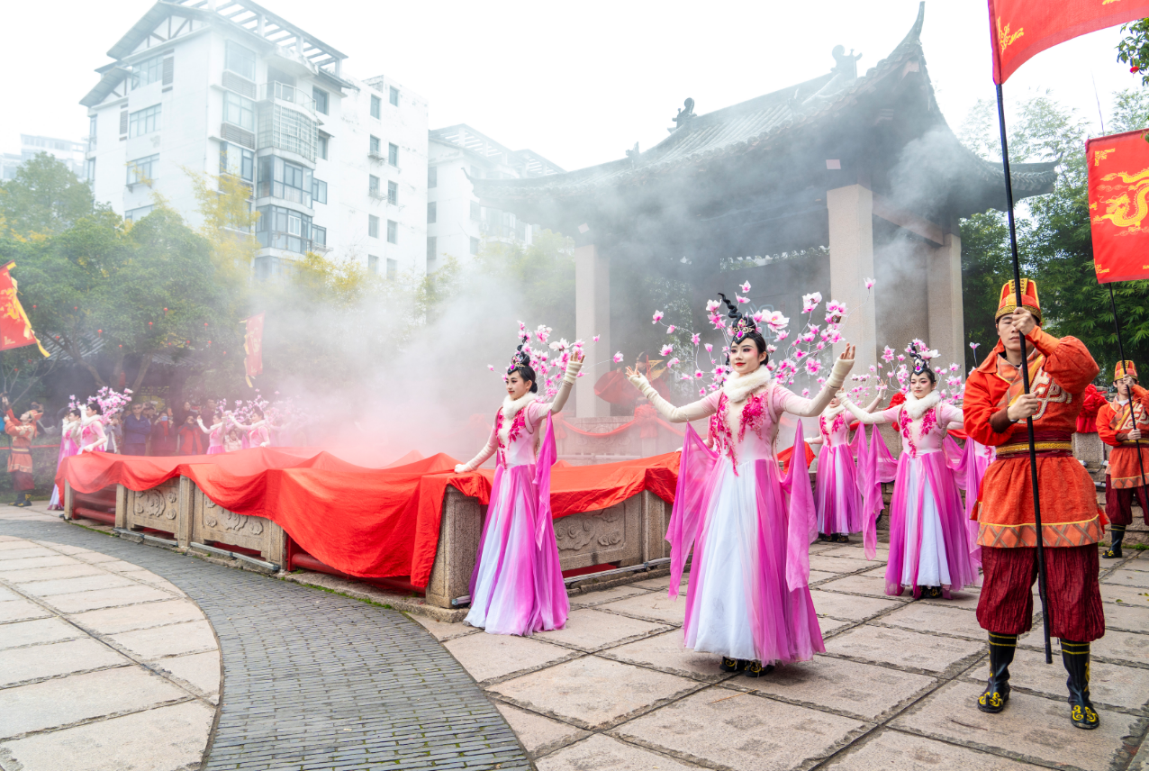 仪式在悠扬的古乐声中开启,身着汉服的“嫦娥仙子”翩翩起舞,重现了嫦娥奔月的动人传说。 随后,工作人员从千年温汤古井中汲取热气腾腾的温泉水,现场分发给游客洗手、点额,寓意洗去旧岁尘埃,迎接新年福运。