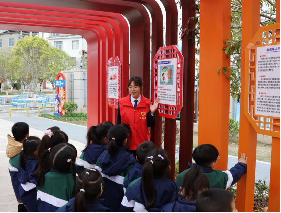 法治文化长廊下,“圈圈大冒险”区域的每个锥桶上都贴有不同的法治标签:“防拐骗”“交通安全”“消防安全”“拒绝欺凌”……孩子们手持彩色套圈,瞄准目标奋力投出,套中哪个标签,就需要回答对应主题的安全知识题。教师石馨月鼓励孩子们做“法治小宣传员”,把学到的法治常识分享给家人和小伙伴。