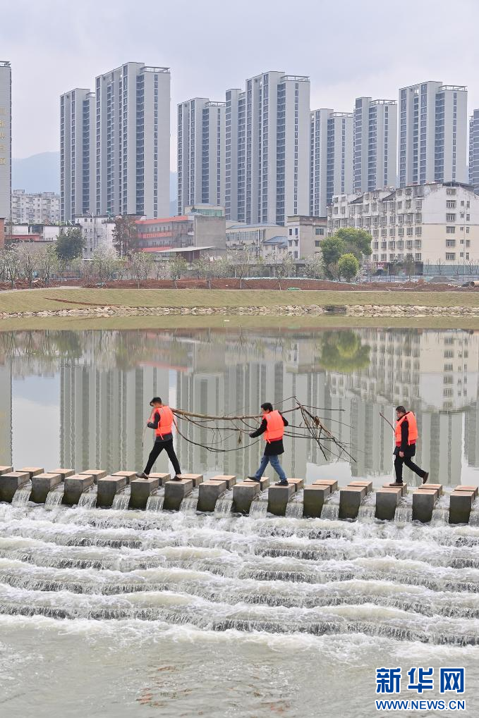 3月21日,在江西省宜春市万载县康乐街道龙河段,志愿者正在巡河护水,清理河面漂浮垃圾。新华网发 邓龙华 摄