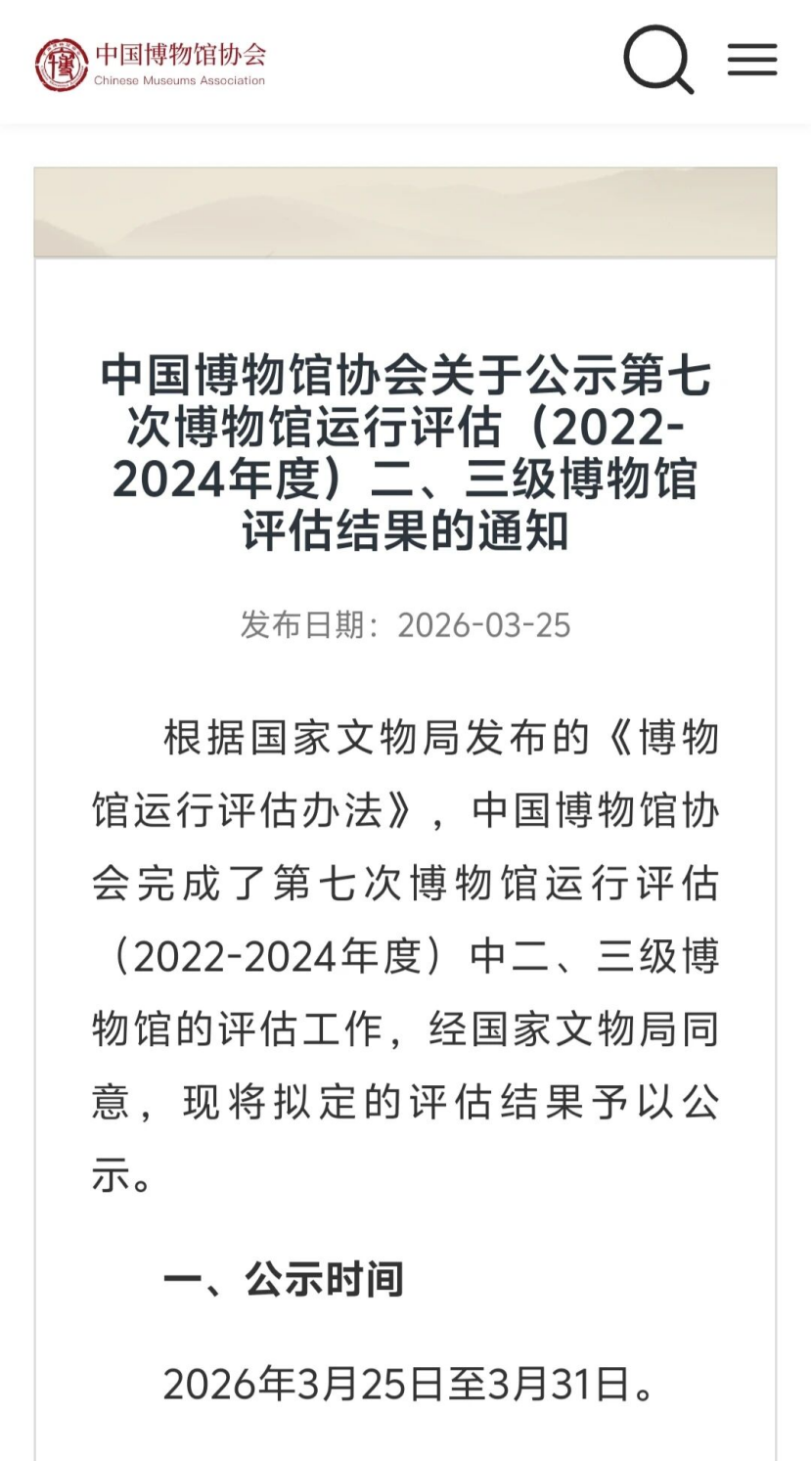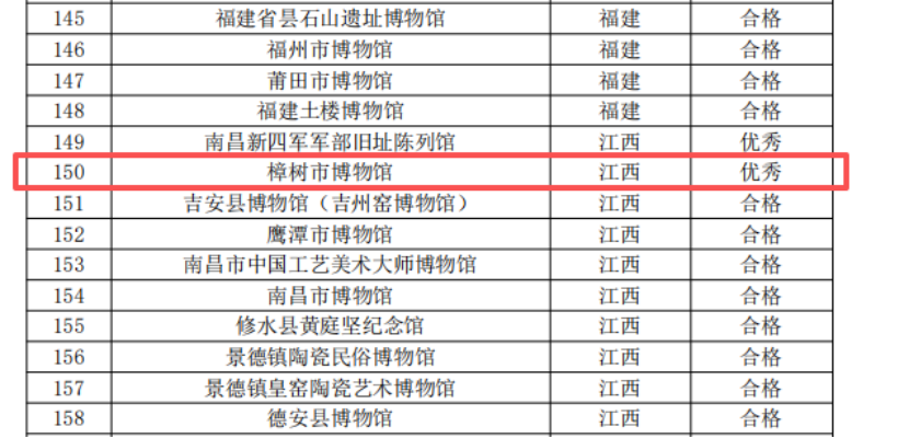 根据国家文物局发布的《博物馆运行评估办法》,中国博物馆协会完成第七次博物馆运行评估(2022-2024年度)中二、三级博物馆的评估工作。评估结果显示,在全国346家参评二级博物馆中,仅54家获评优秀(江西省2家),樟树市博物馆位列其中。今后,樟树市博物馆将继续深耕文物保护、创新展览形式、优化服务体验,争取再创辉煌。