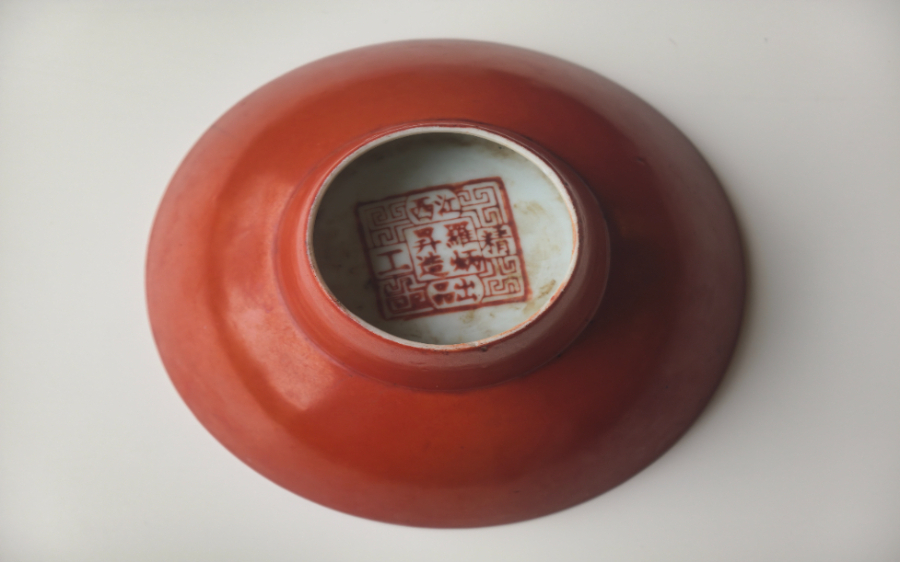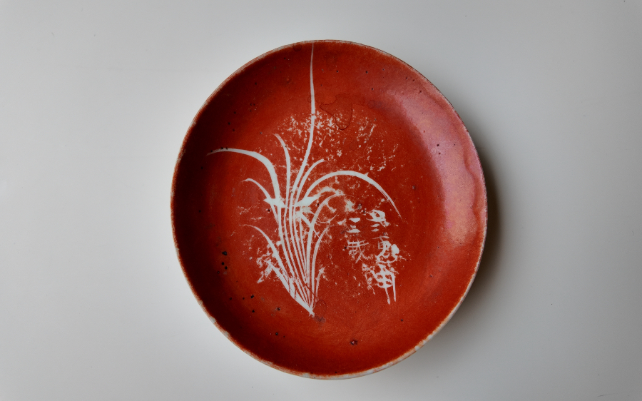 矾红剔画兰草纹碟,采用矾红剔画工艺。摄影|记者朱宸廷