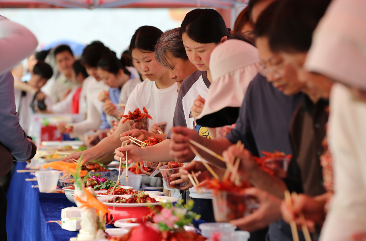 活动现场,欢笑声、吆喝声与铁锅翻炒声交织在一起,烟火气扑面而来。22口大锅依次排开,旺火升腾,厨师们挥勺翻炒,动作麻利。蒜蓉、油焖、香辣……一盘盘小龙虾色泽红亮、整齐上桌,虾壳薄脆、鲜香扑鼻。食客们踮着脚、伸着手,争相品尝,赞不绝口。