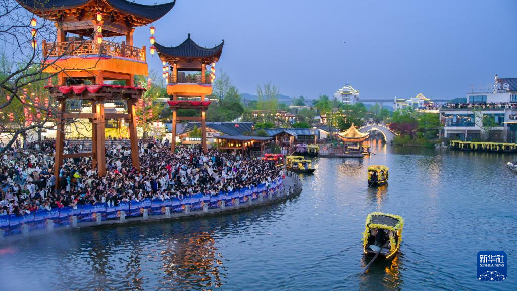 顺着春日的脚步前行,婺源县婺女洲度假区内游人如织,水巷里的花船悠悠划过,两岸繁花与徽派建筑倒映水中,宛如流动的春日画卷。