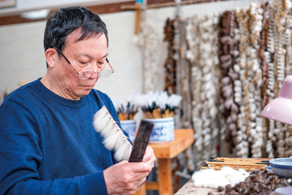 “人要正,心要静。”71岁的周鹏程将毫毛放入水盆中反复梳理。一把起毫刀,轻挑毛料,匀摊压平,根根梳理、搭配,“千万毛中拣一毫”所言非虚。
