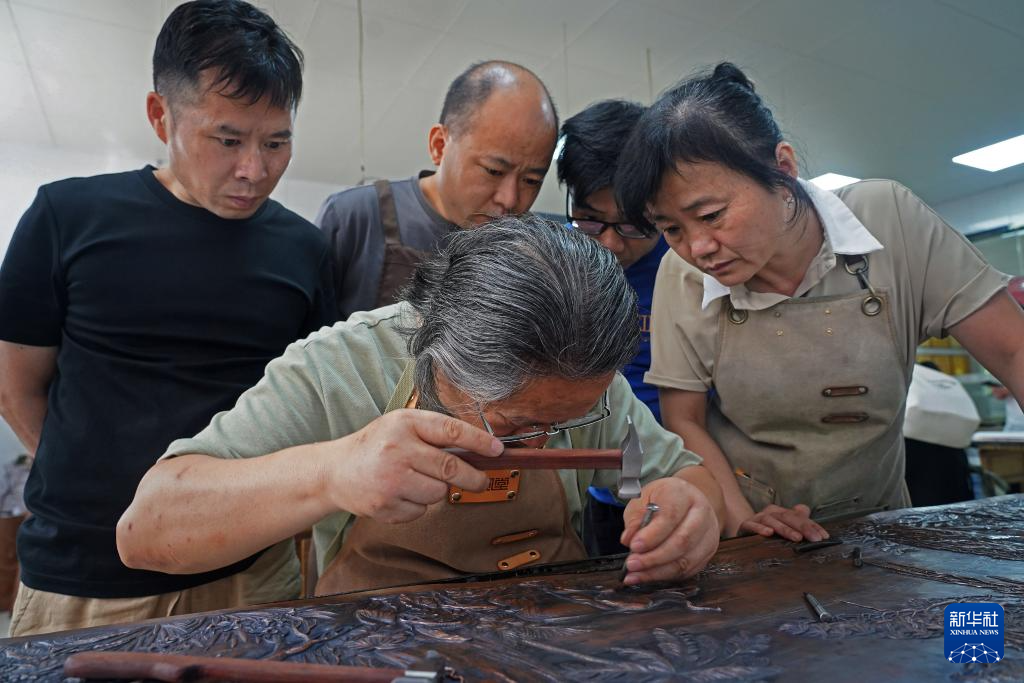 黄俊军(前)在给徒弟们演示铜雕技法(7月13日摄)。新华社记者 万象 摄