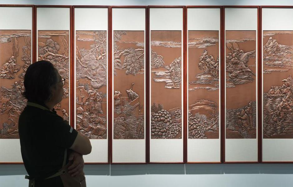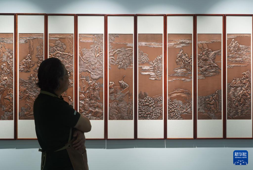 黄俊军在观看自己的铜雕作品《群仙祝寿图》(7月13日摄)。新华社记者 万象 摄 pagebreak
