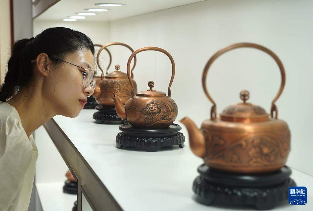 参观者在江西中鼎金属工艺有限公司的展厅里观赏铜壶工艺品(7月13日摄)。新华社记者 万象 摄