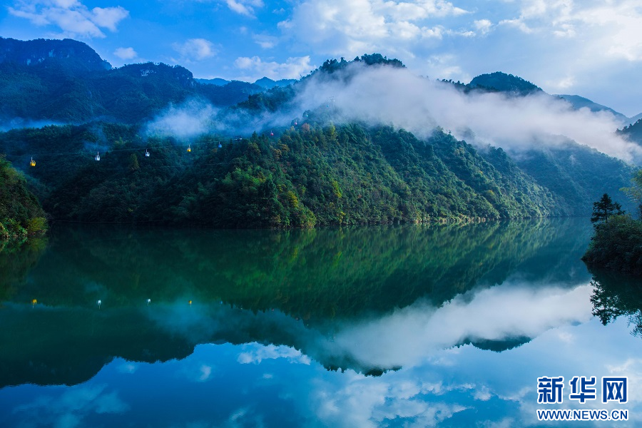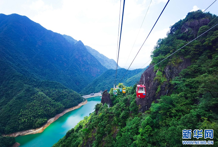 游客们乘坐缆车欣赏大觉山美景。新华网发