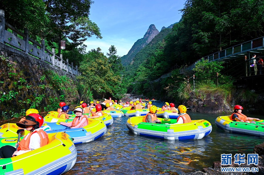 游客们在大觉山漂流。新华网发 黄彬峰 摄