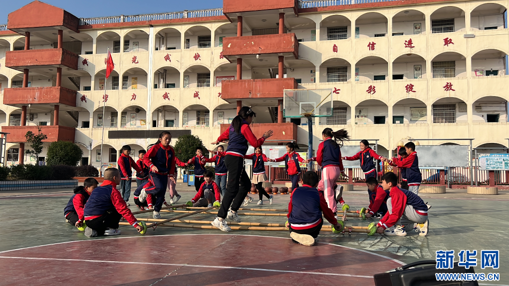 南岗小学的学生课间跳起了竹竿舞。新华网发 熊卓青 摄