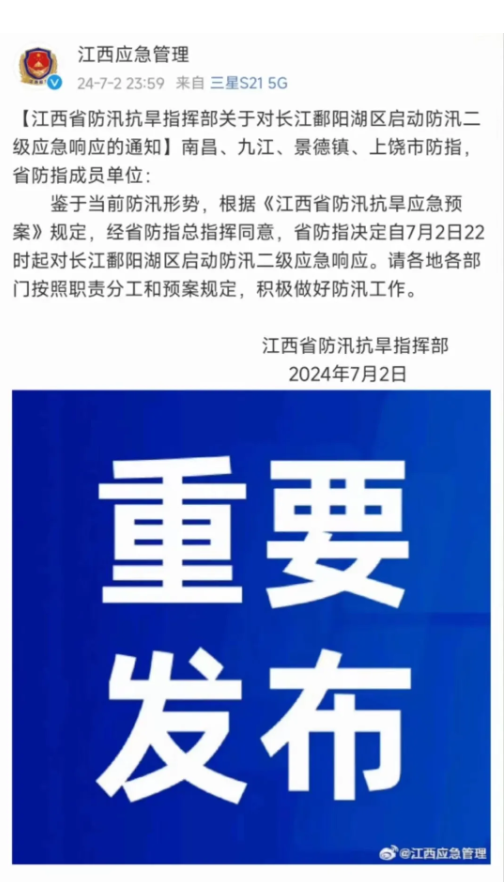 江西省防汛抗旱指挥部7月2日晚发布通知称,鉴于当前防汛形势,根据《江西省防汛抗旱应急预案》规定,经省防指总指挥同意,省防指决定自7月2日22时起对长江鄱阳湖区启动防汛二级应急响应。各地各部门按照职责分工和预案规定,积极做好防汛工作。