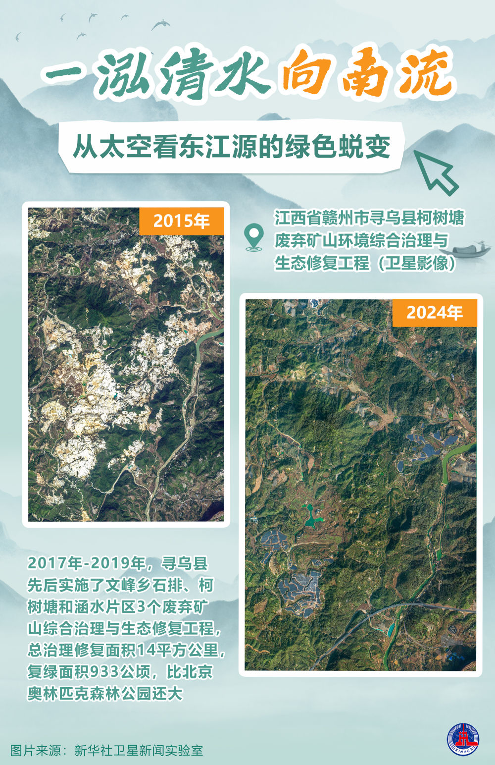 为确保香港同胞喝上放心水,2016年以来,江西省赣州市寻乌县对东江源头重要生态区造林绿化,森林覆盖率由1979年的45%提高到目前的82.37%,桠髻钵山森林覆盖率稳定在95%以上;安远县对森林资源禁伐、河道水库禁渔、矿产河砂禁采,2003年以来新增造林面积25万亩,3200多名生态护林员日常巡护源区……数据显示,近年来东江流域出境水质保持100%达标。当地一系列举措让东江源青山常在、绿水长流,确保一泓清水流向“东方之珠”。让我们通过4组卫星影像对比图,看东江水源地的生态变化。