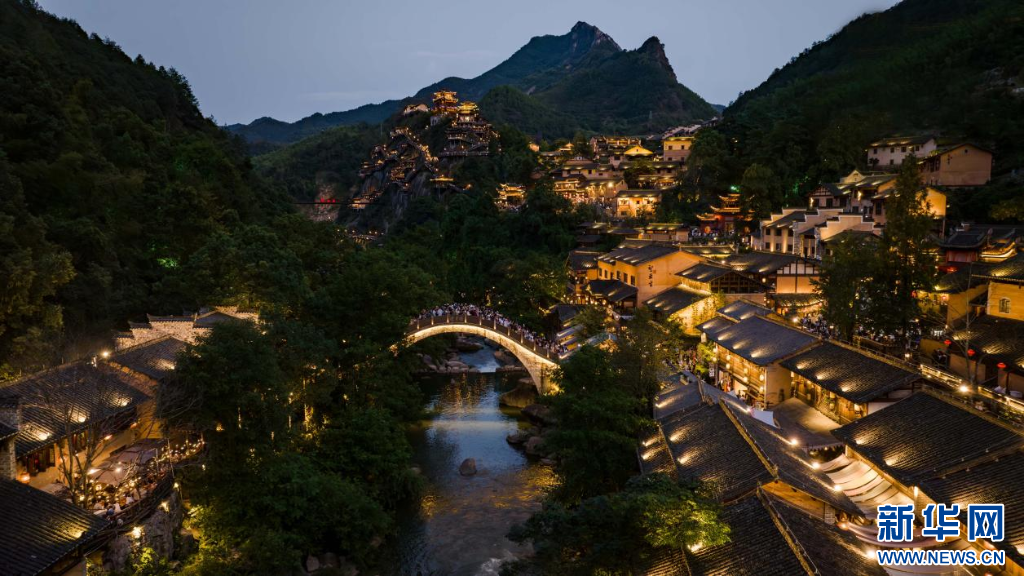 夜幕降临,望仙谷景区在灯光的映照下,摇身化作现实中的“仙侠世界”。新华网发