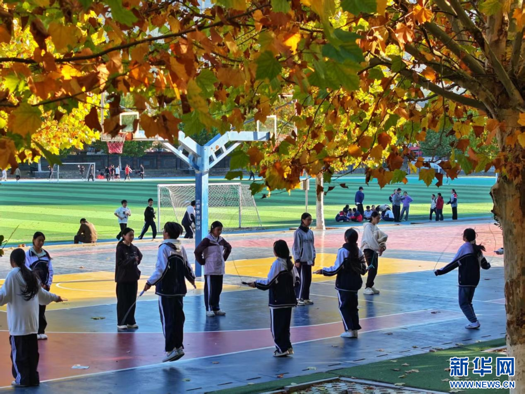 同学们课间在操场跳绳、运动。新华网发 王强 摄