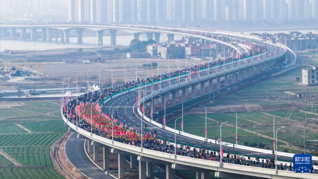 1月3日,在南昌市隆兴大桥,市民参加健步行活动,庆祝隆兴大桥即将通车(无人机照片)。