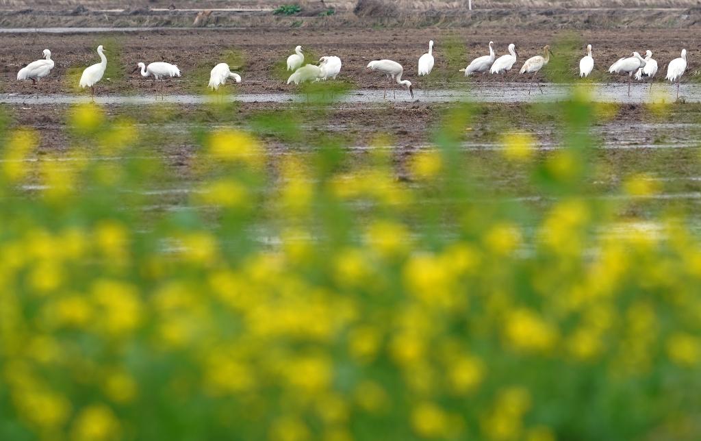 初春时节,上千只白鹤齐聚鄱阳湖畔的江西省上饶市余干县白鹤洲栖息觅食。它们时而凌空飞舞,时而滩涂嬉戏,构成一幅生机盎然的生态画卷。