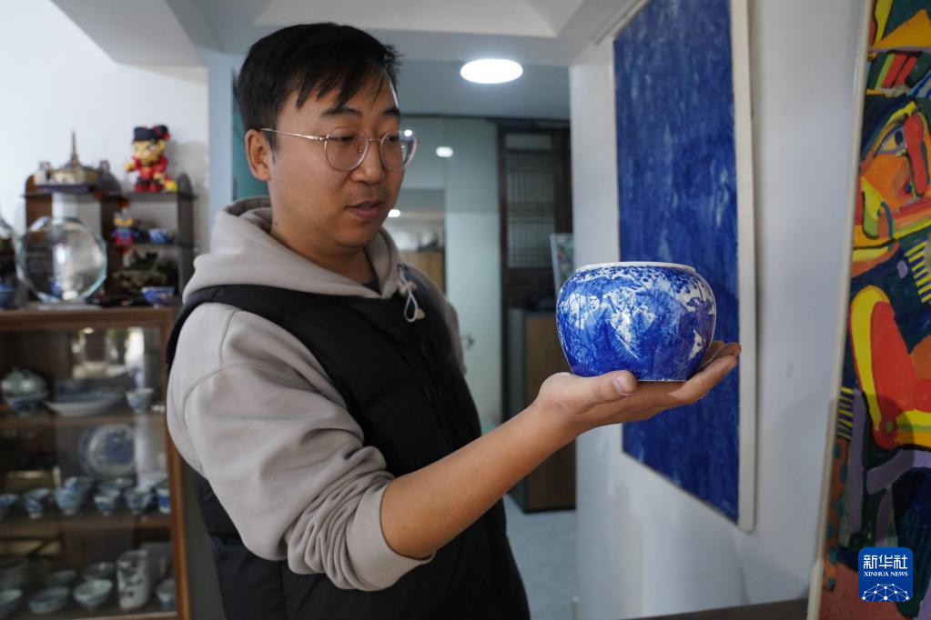 曹浪展示融入油画技法创作的青花瓷茶具(3月11日摄)。新华社记者 周密 摄