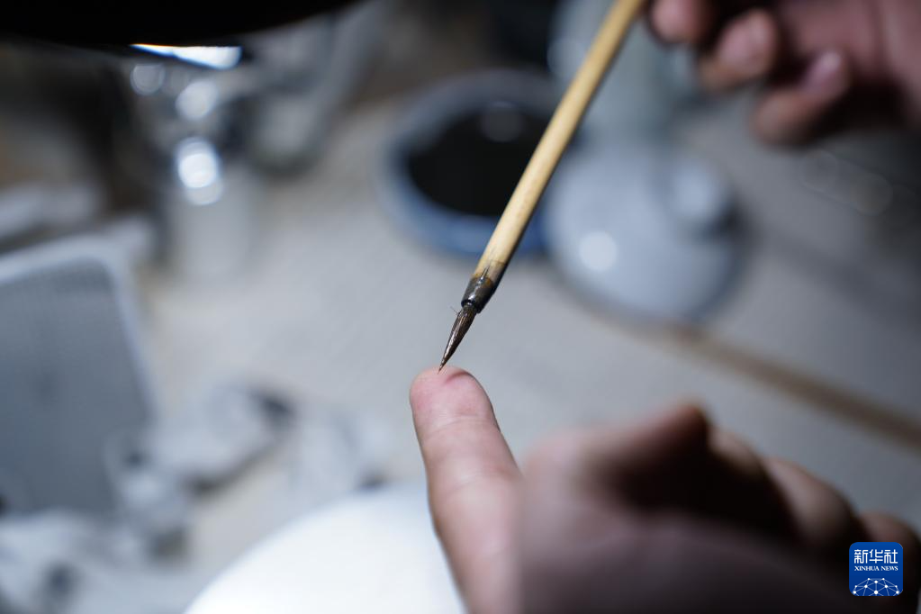 曹浪展示他画青花瓷时的专用毛笔(3月11日摄)。设计一件青花瓷时,他需要用这样的毛笔在一个杯子上画几天甚至数周。新华社记者 周密 摄