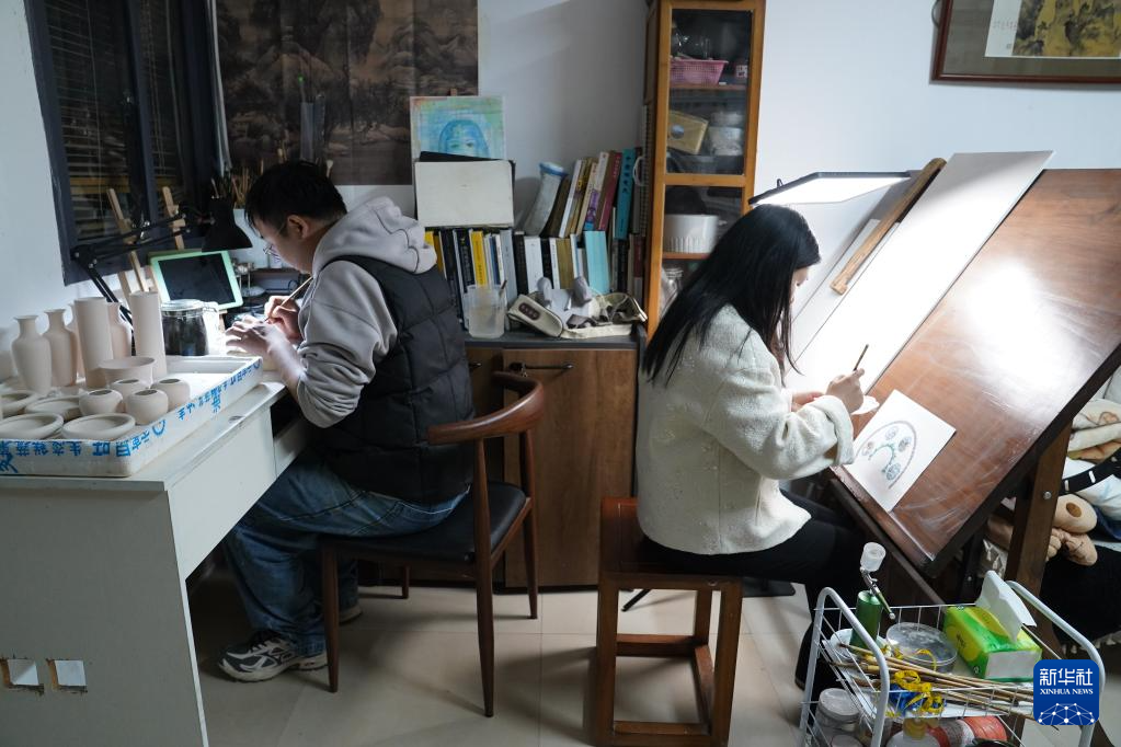 曹浪、胡韵月夫妇在查阅书籍设计陶瓷样式(3月11日摄)。新华社记者 周密 摄